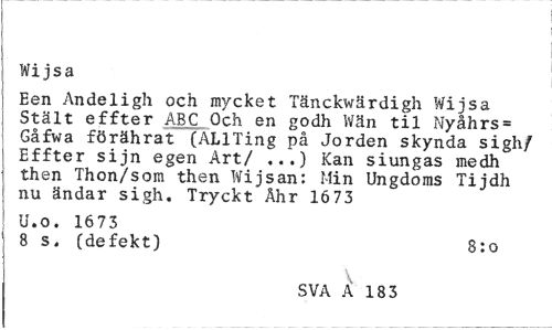 //// Wi jsa //// Een Andeligh och mycket Tänckwärdigh Wijsa Stält effter ABC Och en godh Wän til Nyåhrs= Gåfwa förährat (ALlTing på Jorden skynda sigh/ Effter sijn egen Art/ ...) Kan siungas medh then Thon/som then Wijsan: Min Ungdoms Tijdh nu ändar sigh. Tryckt Ähr 1673 //// U.o. 16 7 3 //// 8 s. (defekt) 8:o //// SVA A 6 183 ////