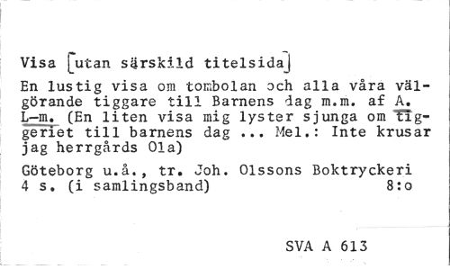 //// Visa |utan särskild titelsida) //// En lustig visa om tombolan och alla våra välgörande tiggare till Barnens dag m.m. af A. L-m. (En liten visa mig lyster sjunga om Tiggeriet till barnens dag ... Mel.: Inte krusar jag herrgårds Ola) //// Göteborg u.å., tr. Joh. Olssons Boktryckeri 4 s. (i samlingsband) 8:0 //// SVA A 6 613 ////