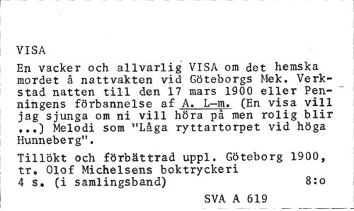 //// VISA //// En vacker och allvarlig VISA om det hemska mordet å nattvakten vid Göteborgs Mek. Verkstad natten till den 17 mars 1900 eller Penningens förbannelse af A. L-m. (En visa vill jag sjunga om ni vill höra på men rolig blir ...) Melodi som "Låga ryttartorpet vid höga Hunneberg". //// Tillökt och förbättrad uppl. Göteborg 1900, tr, Olof Michelsens boktryckeri 4 s. (i samlingsband) 8:o //// SVA A 619 ////