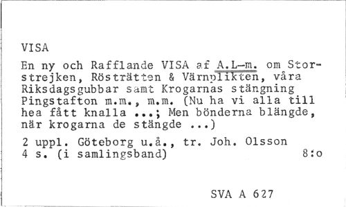//// VISA //// En ny och Rafflande VISA af A.L-m. om^Storstrejken, Rösträtten & Värnplikten, våra Riksdags gubbar samt Krogarnas stängning Pingstafton m.m., m.m. (Nu ha vi alla till hea fått knalla Men bönderna blängde, //// när krogarna de stängde ...) //// 2 uppl. Göteborg u.å., tr. Joh. Olsson 4 s. (i samlingsband) 8Jo //// SVA A 6 27 ////