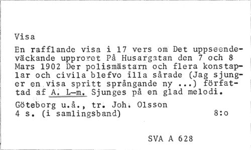 //// Visa //// En rafflande visa i 17 vers om Det uppseendeväckande upproret På Husargatan den 7 och 8 Mars 1902 Der polismästarn och flera konstaplar och civila blefvo illa sårade (Jag sjunger en visa spritt språngande ny ...) författad af A. L-m. Sjunges på en glad melodi, //// Göteborg u.å., tr. Joh. Olsson 4 s. (i samlingsband) 8:o //// SVA A 6 628 ////