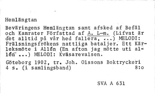 //// Hemlängtan //// Beväringens Hemlängtan samt afsked af Befäl och Kamrater Författad af A. L-m. (Lifvat är det alltid på vår hed fallera, . ..) MELODI: Frälsnings frökens nattliga bataljer. Ett Kärleksmöte i Allén (En afton jag mötte uti allén*...) MELODI: Kväsarevalsen. //// Göteborg 1902, tr. Joh. Olssons Boktryckeri 4 s. (i samlingsband) 8:0 //// SVA A 6 631 ////