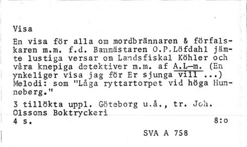 //// Visa //// En visa för alla om mordbrännaren & förfals-karen m.m. f.d. Banmästaren O.P.LÖfdahl jämte lustiga versar om Landsfiskal Köhler och våra knepiga detektiver m.m. af A.L-m. (En ynkeliger visa jag för Er sjunga vxTT~...) Melodi: som "Låga ryttartorpet vid höga Hunneberg. " //// 3 tillökta uppl. Göteborg u,å., tr. Joh. Olssons Boktryckeri //// 4 s. 8:0 //// SVA A 75 8 ////
