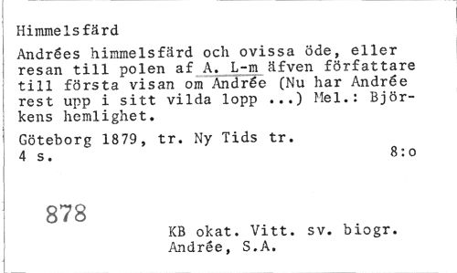 //// Himmelsfärd //// Andrées himmelsfärd och ovissa öde, eller resan till polen af A. L-m äfven författare till första visan om Andrée (Nu har Andrée rest upp i sitt vilda lopp ...) Mel.: Björkens hemlighet. //// Göteborg 1879, tr. Ny Tids tr. 4 s. 8:0 //// 878 //// KB okat. Vitt. sv. biogr. //// Andrée, S.A. ////
