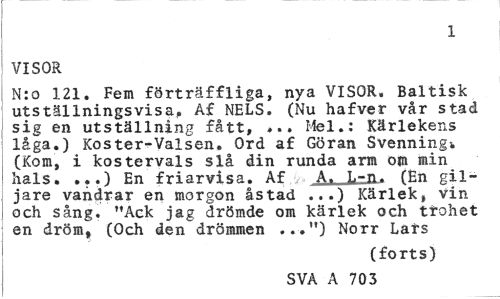//// i //// VISOR //// N:o 121. Fem förträffliga, nya VISOR. Baltisk utställningsvisa,. Af NELS. (Nu hafver vår stad sig en utställning fått, ... Hel.: Kärlekens låga.) Koster-Valsen. Ord af Göran Svenning* (Kom, i kostervals slå din runda arm om min hals. ...) En friarvisa. Af A. L-n. (En gil-jare vandrar en morgon åstad ...) Kärlek, vin och sång. "Ack jag drömde om kärlek och ttohet en dröm, (Och den drömmen ...") Norr Lars //// (forts) //// SVA A 6 703 ////