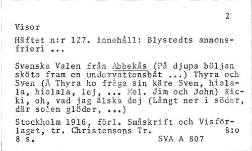 //// 2 //// Visor //// Häftet n:r 127. innehåll: Blystedts annonsfrieri ... //// Svenska Valen från Abbekås (På djupa böljan sköto fram en undervattensbåt ...) Thyra och Sven (A Thyra ho fråga sin käre Sven, hiola-la, hiolala, lej, ... Mel. Jim och John) Kicki, oh, vad jag älska dej (Långt ner i söder, där solen glöder, ...) //// Stockholm 1916, förl. Småskrift och Visförlaget, tr. Christensons Tr. 8:o 8 s. SVA A 80 7 ////