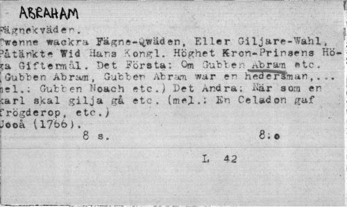 //// kut^m //// &gnekväder. //// 'verme wackra Fägne-^wäden, Eller Giljare-Wahl, 'å tänk te Wid Har,a Konsjl. Höghet Kron-Prinaens Höja Giftermål. Det Första: Gm GubYen Abram etc. Gubben Abram, Gubben Abram war en hedersman, . .. isl.; Gubben Noach etc.) Det Andra; J*är som en :arl skal gilj a gå etc. (mel.; En Celadon gaf "rögderop, etc.) looå (1766). //// 8 s. 8.0 //// L 42 ////