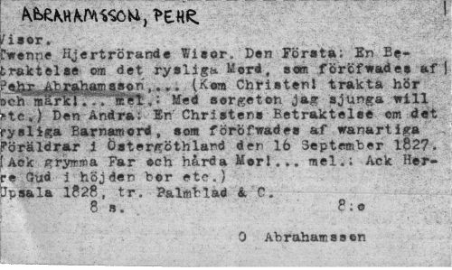//// ' i »or, //// Nrenne HjertrÖ rande Wieor, Pen Första; En Betraktelse om det rysliga Mord, som förcfwades af | >e^x4brahamason ... (Kom Christen! trakta hör »ch »artcTTvTmtt-,: Med sorgeton jag sjunga will //// c») Den Andra; En Christens Betraktelse em det rysliga Barnamord, som föröfwades af wanartiga föräldrar i Östergöthlard den 16 September l$27. Ack grymma Far ech hårda M®rl... mel.; Ack Her-•e Gud i höjden ber etc.) Jp sa la 1828, tr. Palmblad & C. //// 8 s. P:o //// * v //// 0 Abrahamsa©n ////