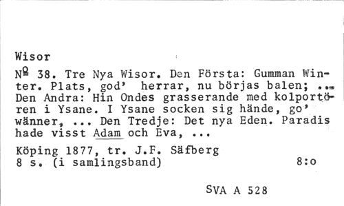//// Wisor //// N- 38. Tre Nya Wisor. Den Första: Gumman Win-ter. Plats, god' herrar, nu börjas balen; . Den Andra: Hin Ondes grasserande med kolportören i Ysane. I Ysane socken sig hände, go» wänner, ... Den Tredje: Det nya Eden. Paradis hade visst Adam och Eva, ... //// Köping 1877, tr. J.F. Säfberg 8 s. (i samlingsband) 8:o //// SVA A 52 8 ////