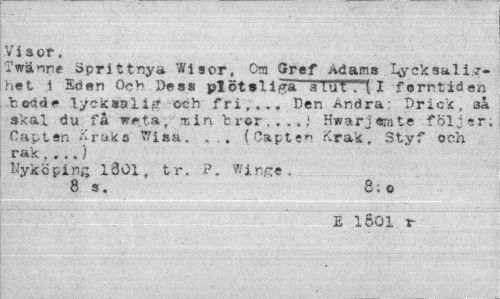 //// Visor. //// Twänne Sprittnya flisor, Om Gref Adams salig- //// hot i Eden Och Dess pl ötsl i ga a lufTt I forntiden "hoade lycicaalig och fri,... Den Andra: Drick, ak skal du få tre ta. t.in brorHwarjsmte följ er; Oaptsn K rak a Wiaa. . .. (Capten. Kräk, Styf och rak , . ..) //// Nyköping 1801, tr. P. V/inge. //// 8 s. 8;o //// E 1601 r ////