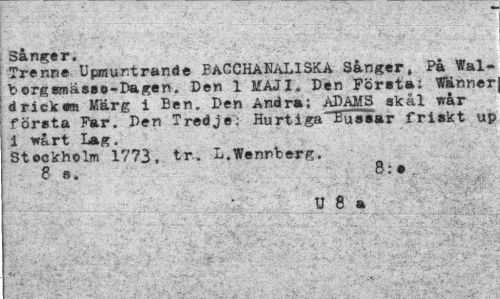 //// Sånger. //// Trenne Upmuntrande BACCHANALISKA Sånger» På Wal» borgsmässs-Dagen, Den 1 MAJI. Den Företa: WEnnei dricksm Märg i Ben. Den Andra: ADAMS skål nkr företa Far. Den Tredje; Hurtiga~Bu»»ar friskt Uf i wårt Lag. //// Stockholm 1773, tr. L.Wennberg. //// 6 s. 8:e //// U 8 a ////