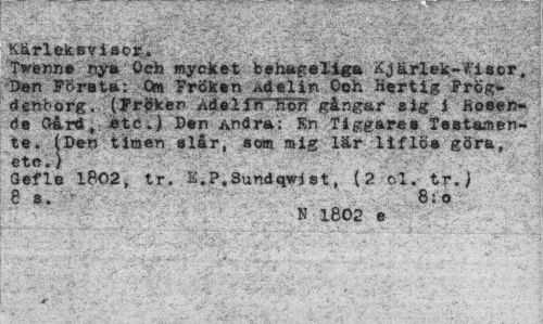 //// -'! ' ' , * -- „ „ //// Kärleksti&oieU V"' • . . *1 //// Twenn® ny» Och mycket behapeliga Kjärlek-Ciscrt. Den Första: Om Fröken ^delin Och Hertig Frög-d€nborg. (yri>ken AdelflTlien gångar eig i hoeen» " de Gård+ etc.) Den Andra: Kn Tiggares Testamente . (Den timen slår, som mig lär liflcs göra, etc.) //// G ef le 1802, tr. l.P.Sundqwist, (2 cl. tr.) 8 8:0 //// N 1802 e //// ¦¦¦•"'¦-- "»'¦ " " '"-r " " -V'-J V"' ' - ' - • ¦¦' "" ' ' * ' ' ////