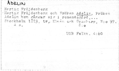 //// UK) //// Hertir, Fröjdenborg //// Hertig FröjdenborR och kröker- Adelir. Fröken Adelin hon irår,fe-ar i ro3endsgf.rd ,... //// Stockholm 1323, tr,.. F.lrr-.«n och Granberg, V.*, o 97. 4 s . B ; o //// UUB Folkv. 4:60 ////