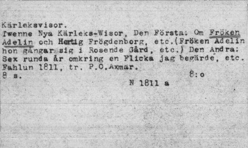 //// Kärleksvisor. //// fwenne Nya Kärleks-Wisor, Den Första; Om Fröken. Ad el in och Hertig Frögdenborg, e t c'. {Fröken Adelln hon 'gangar, sig i Rosende 3ård , etc.) Den Andra; Sex runda &r omkring en Flicka jag begärde", etc. Fahlun l8ll, tr. P.O.Axmar. e s. e.-o //// N 1811 a ////