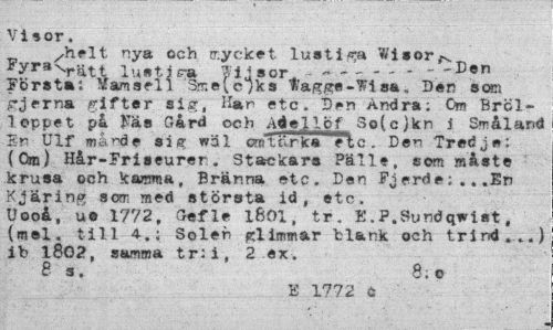 //// Visor. //// /helt nya och mycket lustiga Wisor^ //// Fyra>ätt luetira Wijsor --- - - //// Första: Mamsell 3?r.eic;ks Wagge-Wtsa. Den soei pjerna gifter sig, Han etc. Den ändra; Om Bröl-loppet på Käs Gärd och Adellof 3o(c)kn i Småland En Ulf mi^de aig wäl otntrlrica etc. Den Tredje: (Om) Hår-Friseurer. Stackars PäTle, som måste krusa och kamma, Bränna etc. Den Fjerde;...En Kjärinp; som med största id, etc. Uooå, ue 1772, Gefle lBOl, tr. E.P.Sundqwist, (mel. till 4.; Solen glimmar "blank och trind,».) ib 1802, samma tr:i, 2 ex. //// 8 s. 8; o //// E 1772 C ////