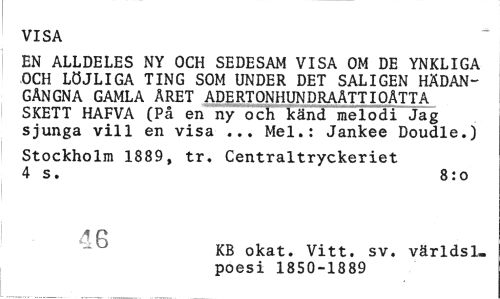 //// VISA //// EN ALLDELES NY OCH SEDESAM VISA OM DE YNKLIGA OCH LÖJLIGA TING SOM UNDER DET SALIGEN HÄDANGÅNGNA GAMLA ARET ADERTONHUNDRAÅTTIOÄTTA SKETT HAFVA (På en ny och känd melodi Jag sjunga vill en visa ... Mel.: Jankee Doudle.) //// Stockholm 1889, tr. Centraltryckeriet 4 s. 8:0 //// A C? //// KB okat. Vitt. sv. världsl- //// poesi 1850-1889 ////