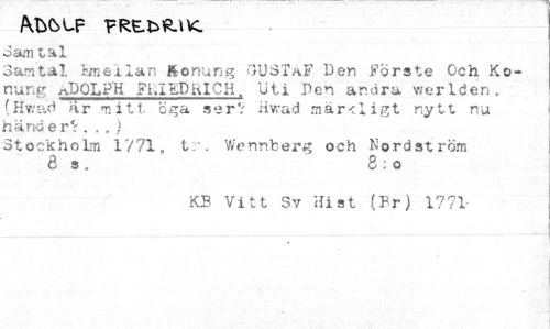 //// 3am tal //// Samtal Emexlan Konung GUSTAF Den Förste Och Konung /J3 OL PH FI, I ED i\ IC H. Uti Den andra v/erlden. (Hv/ad ar mitt- öga ser? Hwad mär<ligt nytt nu händer? . .. } //// Stockholm 1771, tr. Wennberg och Nordström Ös. 8:0 //// KB Vitt Sv Hist (Pr) 1771 ////