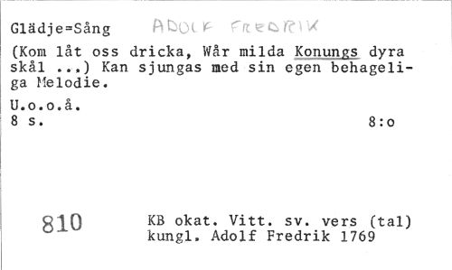//// Glädje=Sång ^ * & fr' / //// (Kom låt oss dricka, Wår milda Konungs dyra skål ...) Kan sjungas med sin egen behageliga Melodie. //// U.o.o.å. //// 8 s. 8:0 //// Q1 Q KB okat. Vitt. sv. vers (tal) //// 0 kungl, Adolf Fredrik 1769 ////