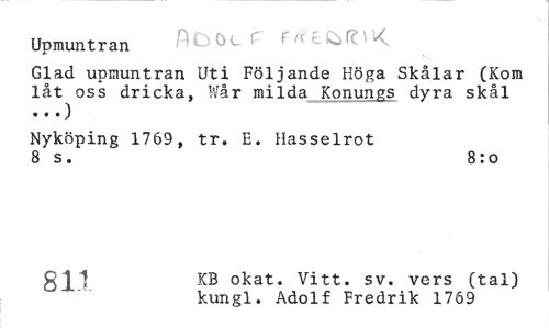 //// Upmuntran Ölf //// Glad upmuntran Uti Följande Höga Skålar (Kom låt oss dricka, Wår milda Konungs dyra skål //// Nyköping 1769, tr. E. Hasselrot 8 s. 8:0 //// Q1 Q KB okat. Vitt. sv. vers (tal) //// 0 kungl, Adolf Fredrik 1769 ////