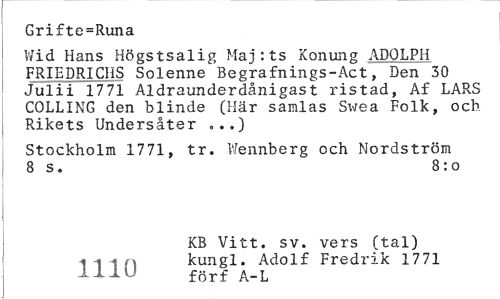 //// Grifte=Runa //// Wid Hans Högstsalig Maj:ts Konung ADOLPH FRIEDRICHS Solenne Begrafnings-Act, Den 30 Julii 1771 Aldraunderdånigast ristad, Af LARS COLLING den blinde (Här samlas Swea Folk, och Rikets Undersåter ...) //// Stockholm 1771, tr. Wennberg och Nordström 8 s. 8:o //// KB Vitt. sv. vers (tal) //// iiin kungl. Adolf Fredrik 1771 //// iiIU förf A-L ////