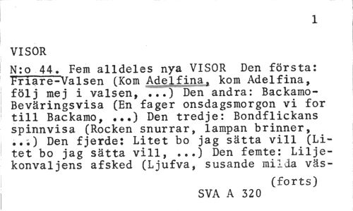//// 1 //// VISOR //// N:o 44. Fem alldeles nya VISOR Den första: Friare-Valsen (Kom Adelfina, kom Adelfina, följ mej i valsen, ...) Den andra: Backamo-Beväringsvisa (En fager onsdagsmorgon vi for till Backamo, ...) Den tredje: Bondflickans spinnvisa (Rocken snurrar, lampan brinner, ..;) Den fjerde: Litet bo jag sätta vill (Litet bo jag sätta vill, ...) Den femte: Liljekonvaljens afsked (Ljufva, susande milda väs- //// (forts) //// SVA A 320 ////