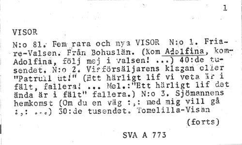 //// 1 //// VISOR //// N:o 81.- Fem rara och nya VISOR Nso 1. Fria-¦ re-Val sen.' Från Bohuslän. (Kom Adolfina, korn-Adolf in a, följ mej i valsenI ...) 40:de tu-sendet, N:o 2. Vifförsäljarens klagan eller "Patrull ut."' (Ett härligt li£ vi veta i c i fält, fallerai ... Mel.:"Ett härligt lif det ända är i fält" fallera.) N:o 3. Sjömannens hemkomst (Om du en väg med mig vill gå 30:de tusendet» Tomelilla-Visän //// (forts) //// SVA A 7 73 ////