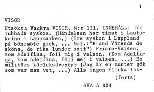 //// 1 //// VISOR //// Utsökta Vackra VISOR. N:r 121. INNEHÅLL: Tre rubbade syskon. (Händelsen har timat i Lauto-keino i Lappmarken.) (Tre syskon i Lappland på bönemöte gick, ... Mel.:"Bland Värends de sköna, de rika lunder satt") Friare-Valsen. Kom Adelfina, föll mig i valsen. (Kom Adelfi-na, kom Adelfina, följ mej i valsen. ...) En militärs kärleksäventyr (Jag är en munter gök som var man vet, ...) Alls ingen flicka las- //// (forts) //// SVA A 804 ////