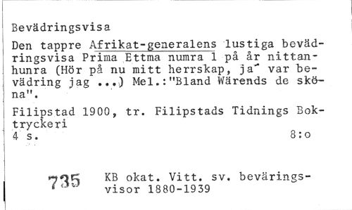 //// Bevädringsvisa //// Den tappre Afrikat-generalens lustiga bevädringsvisa Prima Ettma numra 1 på år nittan-hunra (Hör på nu mitt herrskap, ja" var be-vädring jag ...) Mel.:"Bland Wärends de sköna". //// Filipstad 1900, tr. Filipstads Tidnings Boktryckeri //// 4 s. 8:o //// KB okat. Vitt. sv. bevärings-* visor 1880-1939 ////