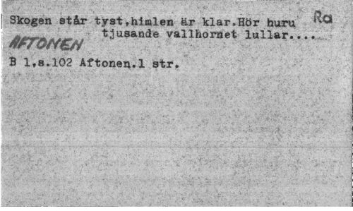 //// Skogen står tyst,himlen är klar,Hör huru //// tjusande vallhornet lullar... //// ttroN&i //// B 1,8.102 Aftonen.1 str. ////