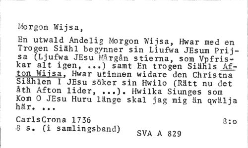 //// Morgon Wijsa, //// En utwald Andelig Morgon Wijsa, Hwar med en Trogen Siähl begynner sin Liufwa JEsum Prij-sa (Ljufwa JEsu Mårgån stierna, som Vpfris-kar alt igen, ...) samt En trogen Siäfils Afton Wiisa. Hwar utinnen widare den Christna Siählen I JEsu söker sin Hwilo (Rätt nu det åth Afton lider, ...). Hwilka Siunges som Kom 0 JEsu Huru länge skal jag mig än qwälja här. ... //// CarlsCrona 1736 8:0 //// 8 s. (i samlingsband) gVA A g2g ////