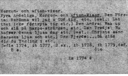 //// ^oro-on- och afton-visor. //// Pyr» Andel i ga , Morgon- och D«n Förs- //// ta: Perömma wil jas o OUd tig, etc. (mel.: x*t thet ick«» förtryta tig etc.) Den Andra: Wak up och sl& på harpo-strängen, etc. Den Tredje: Nu hafwer denna ljusa dag etc. (mel.: Christe sann dansens ljus och etc.) Pen Fjerd«:...3a gläd dig du Yngling 1 et>, //// uefle 1774, it 1777, 2 ex., ib 1778 it 1779,def. 8 «. 6:o //// Z.z 1774 d //// ¦¦ - "'V " ^ r • //// ' . - ¦ -iMM //// rPT^T^-^j ^ il.^ 1'HiMyiHli M ill nliyiPii ii BWwI i 'iti i lllllliimni IIBih1 iiiiiimiihiiiw ii» ////