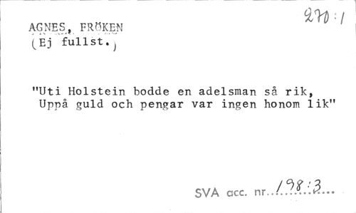 //// mi //// AGNES, FRÖKEN (Ej fullst. //// "Uti Holstein bodde en adelsman så rik, Uppå guld och pengar var ingen honom lik" //// SVA ccc. nr3... ////