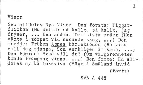 //// 1 //// Visor //// Sex alldeles Nya Visor Den första: Tiggarflickan (Hu det är så kallt, så kallt, jag fryser, ... Den andra: Det sista ordet (Hon växte i torpet vid susande skog, ...) Den tredje: Fröken Agnes kärleksöden (En visa vill jag sjunga, Som verkligen är sann. ...) Den Fjerde: Hvad vill du? (Om välgörenheten kunde framgång vinna, ...) Den femte: En alldeles ny kärleksvisa (Högt i Småland invid //// (forts) //// SVA A 448 ////