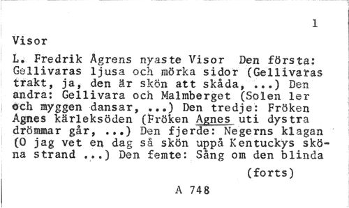 //// 1 //// Visor //// L. Fredrik Ågrens nyaste Visor Den första: Gellivaras ljusa och mörka sidor (Gellivaras trakt, ja, den är skön att skåda, ...) Den andra: Gellivara och Malmberget (Solen ler och myggen dansar, ...) Den tredje: Fröken Agnes kärleksöden (Fröken Agnes uti dystra drömmar går, ...) Den fjerde: Negerns klagan (0 jag vet en dag så skön uppå Kentuckys sköna strand ...) Den femte: Sång om den blinda //// (forts) //// A 748 ////