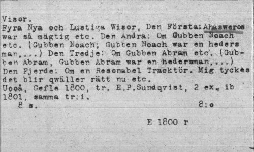 //// Visor. //// Fyra Nya och Lustiga Wisor, Den Första;Almsweros war så naägtig etc. Den Andra; Om Subben"Toacfr etc. (Gubben Noach; Gubten Noach war en heders mar,.,.) Den Tredje: Om Gubben Abram etc. (Gubben Abram, Gubben Abram war en hedersman,...) Den Fjerde; Om en Resonabel Tracktör. Mig tyckes det blir qwäller rätt nu etc. //// Uooå, Gefle l800, tr, E.P.Sundqvi st, 2 ex, ib 1801, samma tr;i. //// 8 s. 8;o //// E 1800 r ////