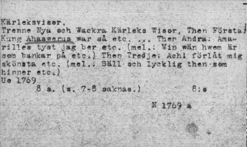 //// Kärleksvisor. //// Trenne Nya och Wackra Kärleks '"isor, Then Första; Kung Ahj^aJ-gxiLa mr aå etc, ... Then Andra; Ana-rille"» tyst jag ber <rte» (mel.; Min wär, hwem är som bankar på etc.) Then Tredje; Aehl förlåt mig skönsta etc. (mel.; Säll och lycklig then-som hinner etc.) Ue 1769 //// 8 s. (s. 7-5 saknas.) . * 8;• //// K 1769 * //// '*¦-,>'''-- „ 'i,'.' å0Sti' ¦-/ ////