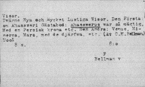 //// Visor. //// Twanne Nya och ^ysVet Lustiea Tisor. Den Första; ofj A^assweri ftäst&bod; Ahasswerua »ar så mägtig, Med en Persisk krona etc. Den Ånd ra: Venu s, Ml-nerva, Mars, ^ed de djarfwa, etc. C.K.BéUman. //// TJooa //// 8a. 8:o //// F //// Bellman v ////