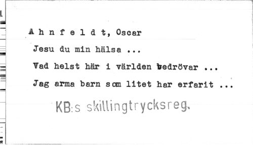 //// ~ Ahnfeldt, Oscar Jesu du min hälsa ... ~ Vad helst här i världen toedrövar ... //// Jag arma barn scm litet har erfarit ... //// KB.s s killin g t rycks reg. //// i... ////