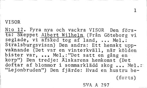 //// 1 //// VISOR //// N:o 12» Fyra nya och vackra VISOR Den första: Skeppet Albert Wilhelm._ (Från Göteborg vi seglade, vi afs&ed tog af land, ... Mel.: Stralsburgsvisan) Den andra: Ett hemskt uppvaknande (Det var en vinterkväll, när kölden bister var, ... Mel.:"Det satt en gång en korp") Den tredje: Älskarens hemkomst (Det doftar af blommor i sommarklädd skog ... Mel.r "Lejonbruden") Den fjärde: Hvad en hustru be- //// (forts) //// SVA A 297 ////