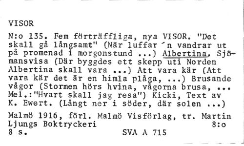 //// VISOR //// N:o 135. Fem förträffliga, nya VISOR. "Det skall gå långsamt" (När luffar " n vandrar ut på promenad i morgonstund ...) Albertina. Sjömansvisa (Där byggdes ett skepp uti Norden Albertina skall vara ...) Att vara kär (Att vara kär det är en himla plåga, ,..) Brusande vågor (Stormen hörs hvina, vågorna brusa, ... Mel.:"Hvart skall jag resa") Kicki, Text av K. Ewert. (Långt ner i söder, där solen ...) //// Malmö 1916, förl. Malmö Visförlag, tr. Martin Ljungs Boktryckeri 8:0 //// 8 s. SVA A 715 ////