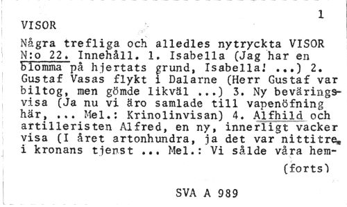 //// 1 //// VISOR //// Några trefliga och alledles nytryckta VISOR N:o 22. Innehåll. 1. Isabella (Jag har en blomma på hjertats grund, Isabella.' ...) 2. Gustaf Vasas flykt i Dalarne (Herr Gustaf var biltog, men gömde likväl ...) 3. Ny bevärirtgs-visa (Ja nu vi äro samlade till vapenöfning här, ... Mel.: Krinolinvisan) 4. Alfhild och artilleristen Alfred, en ny, innerligt vacker visa (I året artonhundra, ja det var nittitre» i kronans tiens t ... Mel.: Vi sålde våra hem- //// (forts*) //// SVA A 989 ////