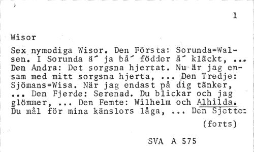 //// i //// 1 //// Wisor //// Sex nymodiga Wisor, Ben Första: Sorunda=Wal-sen, I Sorunda ä" ja bå" födde r å" kläckt, Den Andra: Det sorgsna hjertat. Nu är jag ensam med mitt sorgsna hjerta, ... Den Tredje: Sjömans=Wisa. När jag endast på dig tänker, ... Den Fjerde: Serenad. Du blickar och jag glömmer, ... Den Femte: Wilhelm och Alhilda, Du mål för mina känslors låga, ... Deh Sjettei //// (forts) //// SVA A 575 ////