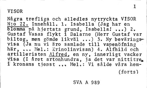 //// X //// VISOR //// Några trefliga och alledles nytryckta VISOR N:o 22. Innehåll. 1. Isabella (Jag har en blomma på hjertats grund, Isabella.' ...) 2. Gustaf Vas as flykt i Dalarne (Herr Gustaf var biltog, men gömde likväl 3. Ny bevärings- //// visa (Ja nu vi äro samlade till vapenöfning här, ... Mel.: Krinolinvisan) 4. Alfhild och artilleristen Alfred, en ny, innerligt vacker visa (I året artonhundra, ja det var nittitre. i kronans tjenst ... Mel,: Vi sålde våra hemförts) //// SVA A 989 ////