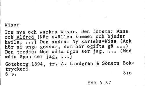 //// Wisor //// Tre nya och wackra Wisor. Den första; Anna och Alfred (När qwällen kommer och bjuder hwila, ...) Den andra: Ny Kärleks=Wisa (Ack hör ni unga gossar, som här ogifta gå ...) Den tredje: Med wåta ögon ser jag, ... (Med wåta ögon ser jag, ...) //// Göteborg 1894, tr. A. Lindgren & Söners Boktryckeri //// 8 s. 8:0 //// SVA A 57 ////