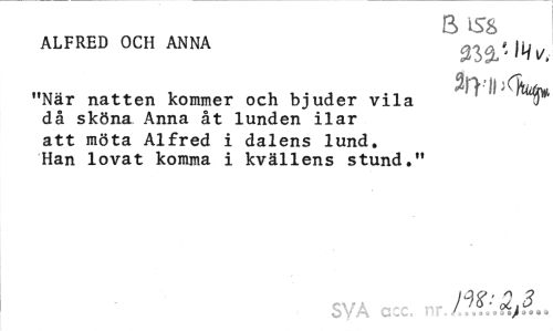 //// b is8 //// ALFRED OCH ANNA //// "När natten kommer och bjuder vila y //// då sköna Anna åt lunden ilar att möta Alfred i dalens lund. Han lovat komma i kvällens stund." //// SVA ccc ÄftL ////
