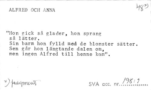 //// ALFRED OCH ANNA ^ ^ //// "Hon gick så gläder, hon sprang så lätter. //// Sin barm hon fylld med de blomster sätter. Sen går hon längtande dalen om, men ingen Alfred till henne kom". //// ^faupyuM SVA ccc. nr./?.?/.?... ////