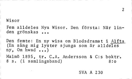 //// 2 //// Wisor //// Fem alldeles Nya Wisor. Den första: När linden grönskas ... //// Den femte: En ny wisa om Blodsdramat i Alfta (En sång mig lyster sjunga som är alldeles ny, Om hwad ...) //// Malmö 1895, tr. C.A. Andersson & C:s boktr. 8 s. (i samlingsband) 8:o //// SVA A 2 30 ////