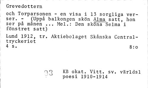 //// Grevedottern //// och Torparsonen - en visa i 13 sorgliga verser. - (Uppå balkongen skön Alma satt, hon ser på månen ... Mel.: Den sköna Selma i fönstret satt) //// Lund 1912, tr. Aktiebolaget Skånska Centraltryckeriet //// 4 s. 8:o //// n.Q KB okat. Vitt. sv. världsl //// poesi 1910-1914 ////