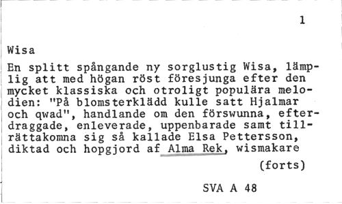 //// 1 //// Wisa //// En splitt spångande ny sorglustig Wisa, lämplig att med högan röst föresjunga efter den mycket klassiska och otroligt populära melodien: "På blomsterklädd kulle satt Hjalmar och qvrad", handlande om den förswunna, efter-draggade, enleverade, uppenbarade samt tillrättakomna sig så kallade Elsa Pettersson, diktad och hopgjord af Alma Rek, wismakare //// (forts) //// SVA A 48 ////