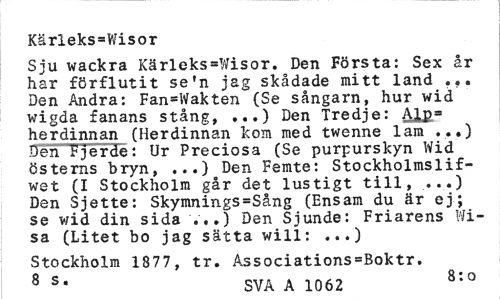 //// Kärleks=Wisor //// Sju wackra Kärleksvisor. Den Första: Sex år har förflutit se*n jag skådade mitt land ... Den Andra: Fan=Wakten (Se sångarn, hur wid wigda fanans stång, ...) Den Tredje: Alp= herdinnan (Herdinnan kom med twenne lam ...) Den Fjerde: Ur Preciösa (Se purpurskyn Wid österns bryn, ...) Den Femte: Stockholmslif-wet (I Stockholm går det lustigt till, ...) Den Sjette: Skymnings=Sång (Ensam du är ej; se wid din sida '.'••) Den Sjunde: Friarens Wisa (Litet bo jag sätta will: ...) //// Stockholm 1877, tr. Associations=Boktr. //// 8 s' SVA A 1062 8:0 ////